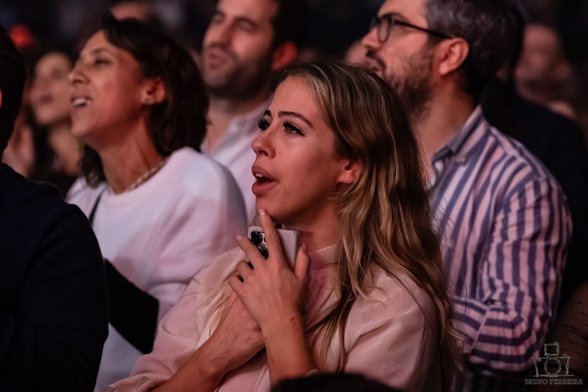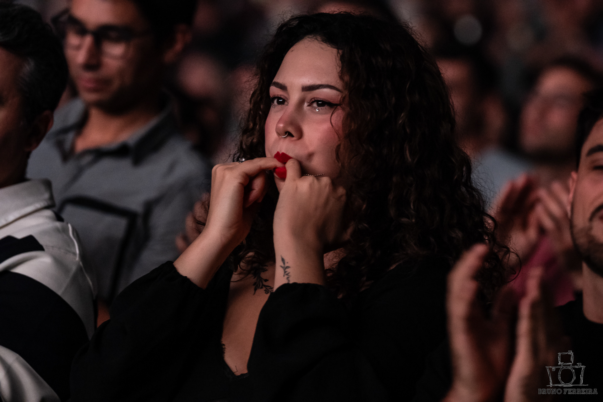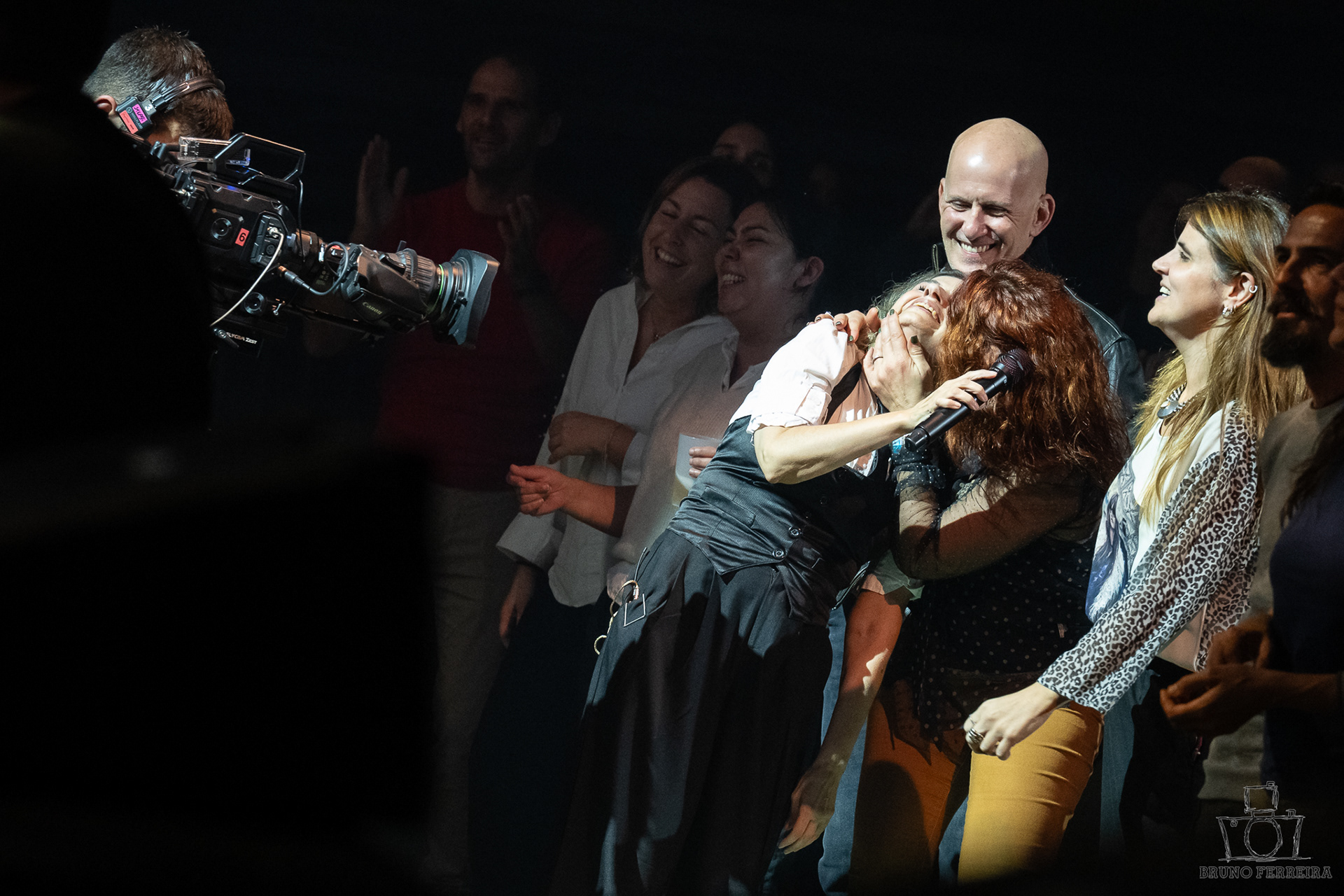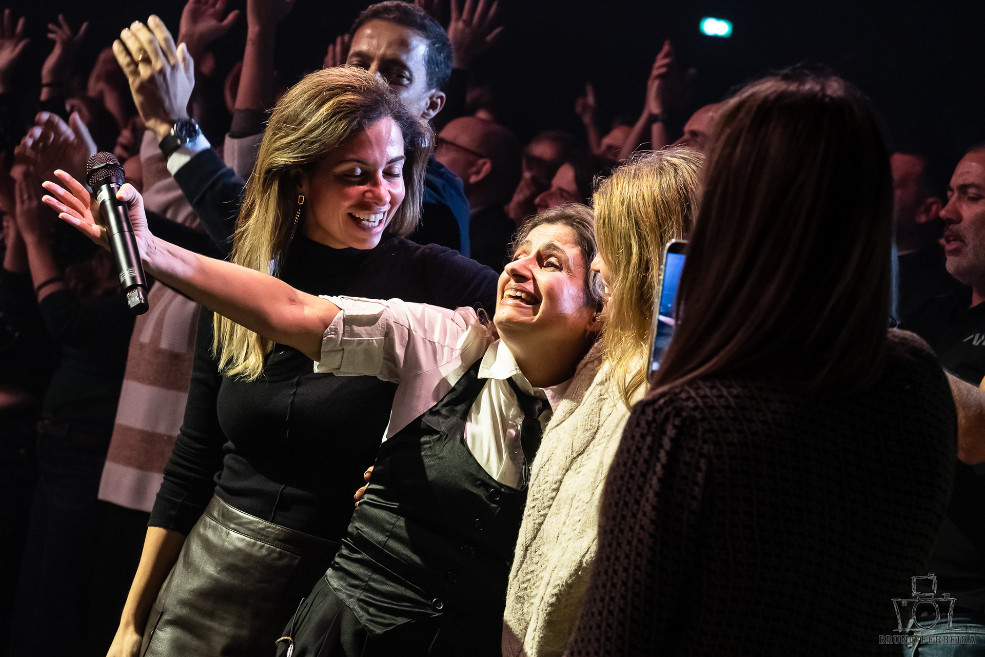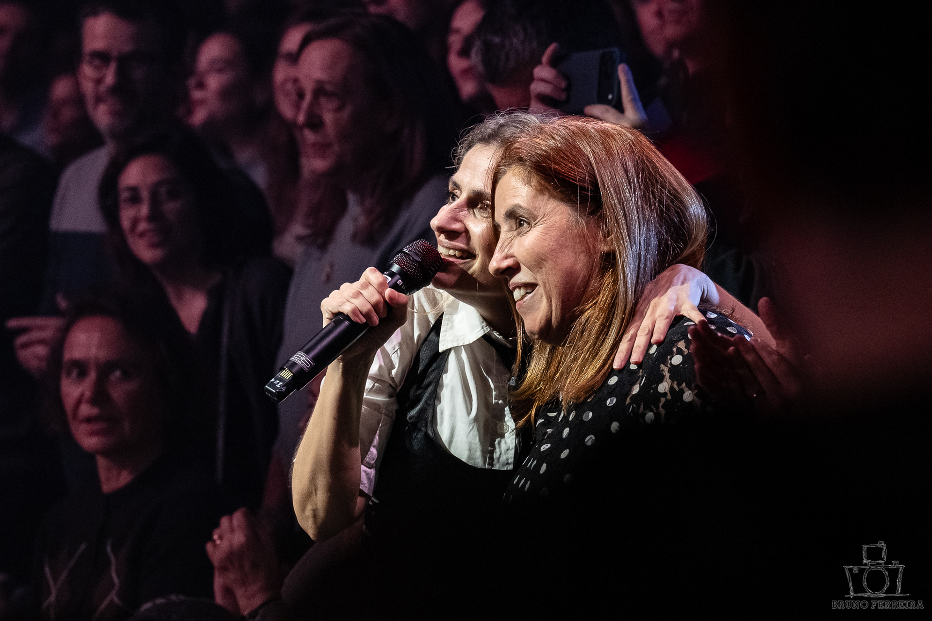 Entre expressões contidas, abraços da plateia e a energia emocional que preenchia a sala, cada fotografia tenta capturar não apenas o espetáculo — mas a experiência de o sentir.
